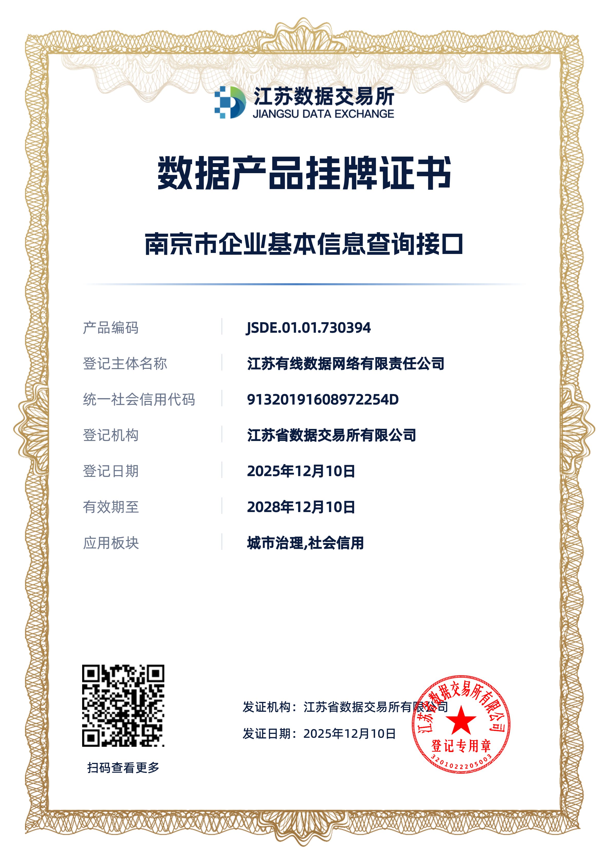 12月10日,由江苏有线数据网络有限责任公司开发的“南京市企业基本信息查询接口”“南京市企业设立登记信息查询”等5款城市治理领域公共数据产品,在江苏省数据交易所南京区域运营中心成功挂牌上架。此举标志着我市在推动公共数据授权运营、价值释放的数据服务生态方面迈出关键一步。