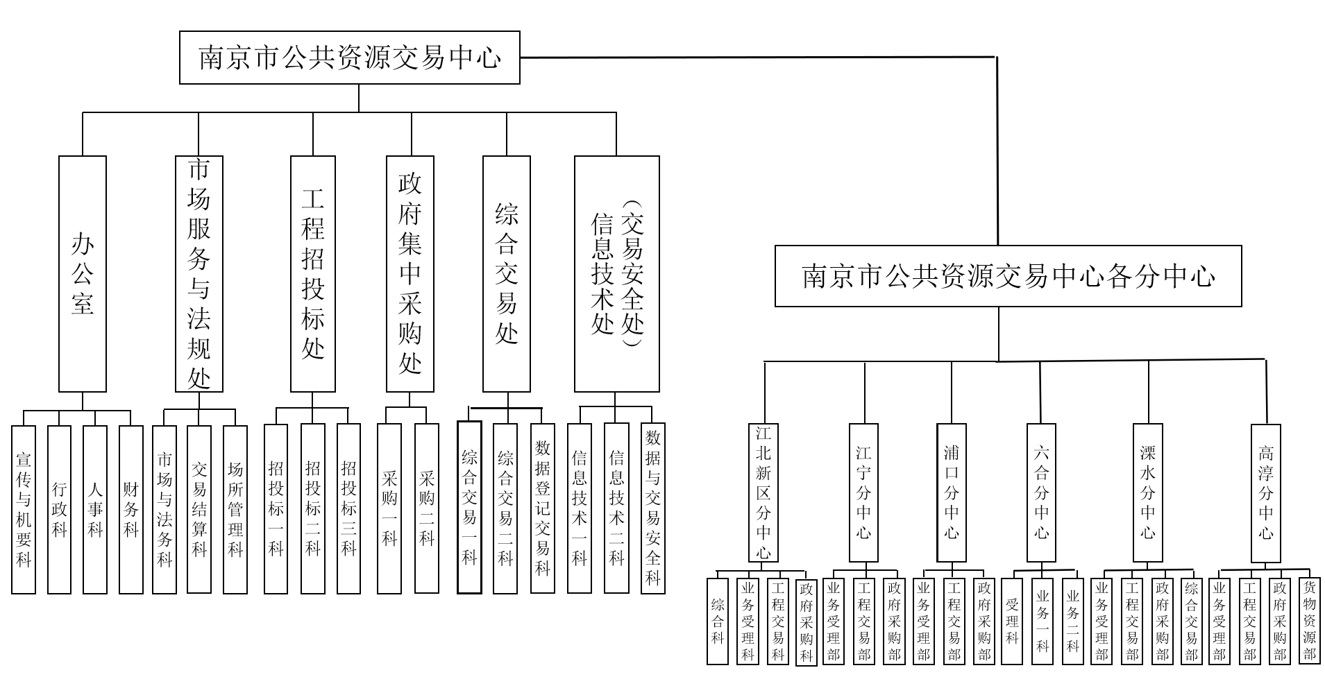 南京市公共资源交易中心于2014年5月正式批准设立,现有员工131名,为全额拨款副局级事业单位,由我市原有市建设工程交易中心、市交通招投标服务中心、市货物招标投标交易中心、市政府采购中心、市产权交易中心、市土地交易中心等6家交易中心,从各职能部门中剥离出来整合建立,承担为全市公共资源交易活动提供场所、信息、咨询、见证等相关服务工作。2016年6月底,按照《市政府办公厅关于印发南京市整合建立统一的公共资源交易中心工作方案的通知》要求,江宁、浦口、六合、溧水、高淳挂牌成立南京市公共资源交易中心分中心,2018年7月,成立南京市公共资源交易中心江北新区分中心,这六个分中心承担为区级投资立项或管辖范围内的公共资源交易活动提供场所、信息、咨询、见证等相关服务工作。